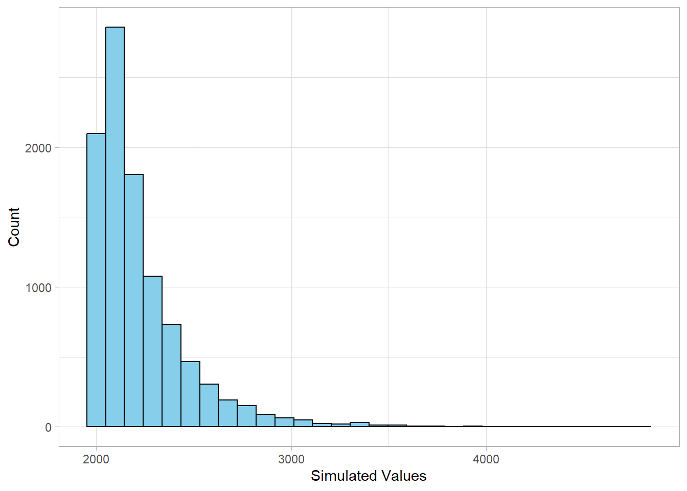 As expected, this distribution is right-skewed, with most values clustered near the minimum value (2000) and a few large values extending into the tail. Since the shape parameter is quite large (\(a\) = 10), the tail is relatively light, and extreme values would occur less frequently compared to smaller \(a\) values.